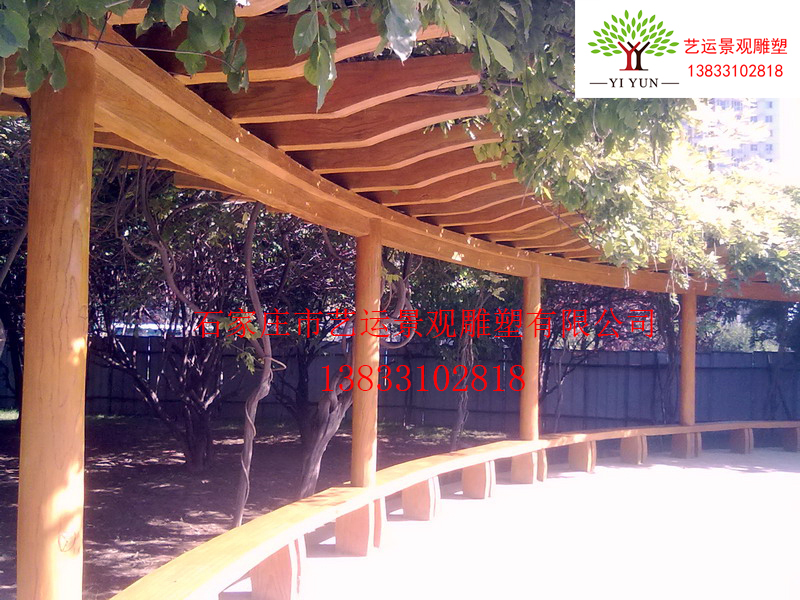 水泥仿木葡萄架是木材的仿制品,從表面效果看和真實木材很相似。制作完成的水泥仿木外觀精美能以假亂真,從表面看它就是木材,水泥仿木產品可塑性強,根據(jù)你的喜好就可以設計出你想要的造型和效果來,特點:使用壽命長比真實木材高10倍以上,堅固耐用。