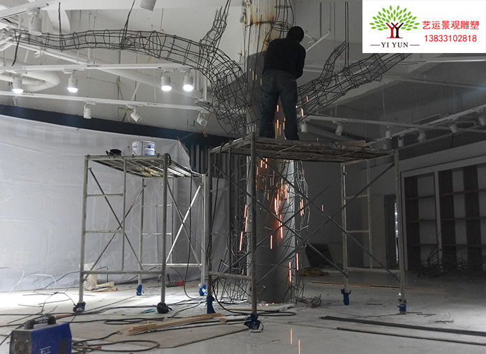 2、焊接鋼筋:用直徑0.65型號的鋼筋焊接在膨脹螺栓上,焊接時手工彎出樹的整體造型,室內(nèi)水泥柱由于空間有限不建議做太大的樹身造型,根據(jù)現(xiàn)場塑造形體適合最好。
